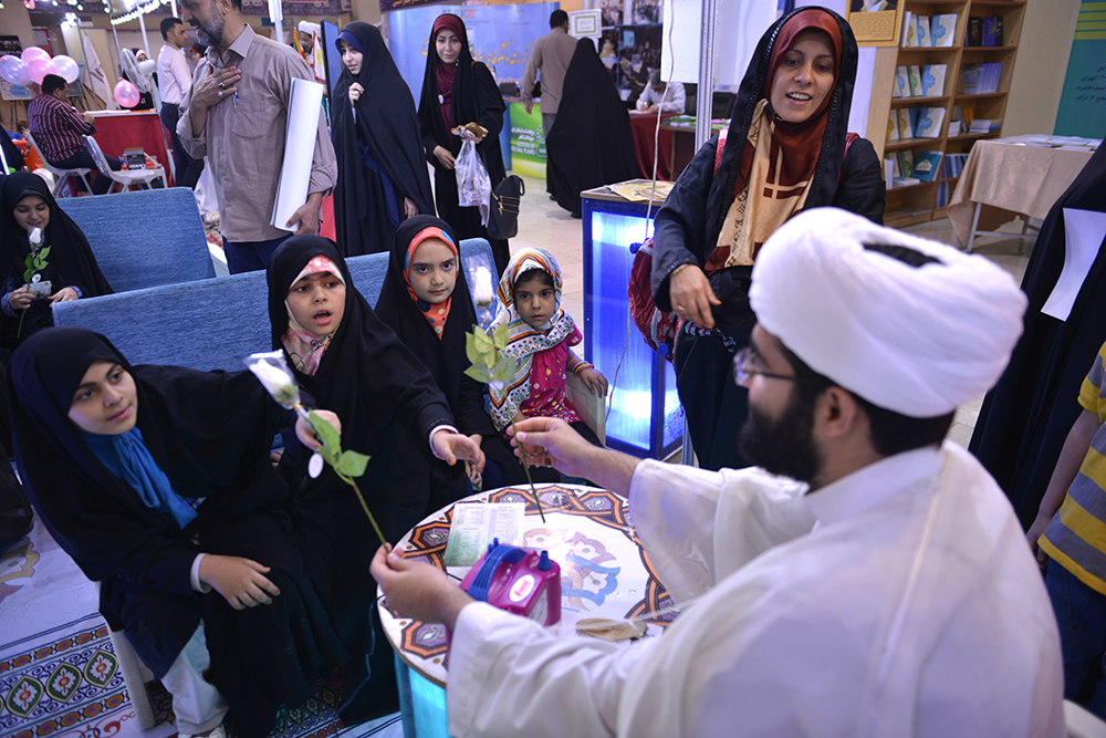 2160--عکس۱۳۹۶/۰۳/۲۵اهداء گل به بازدیدکنندگان نمایشگاه قرآن در شب ولادت امام حسن مجتبی (ع) - عکاس : بیژنی