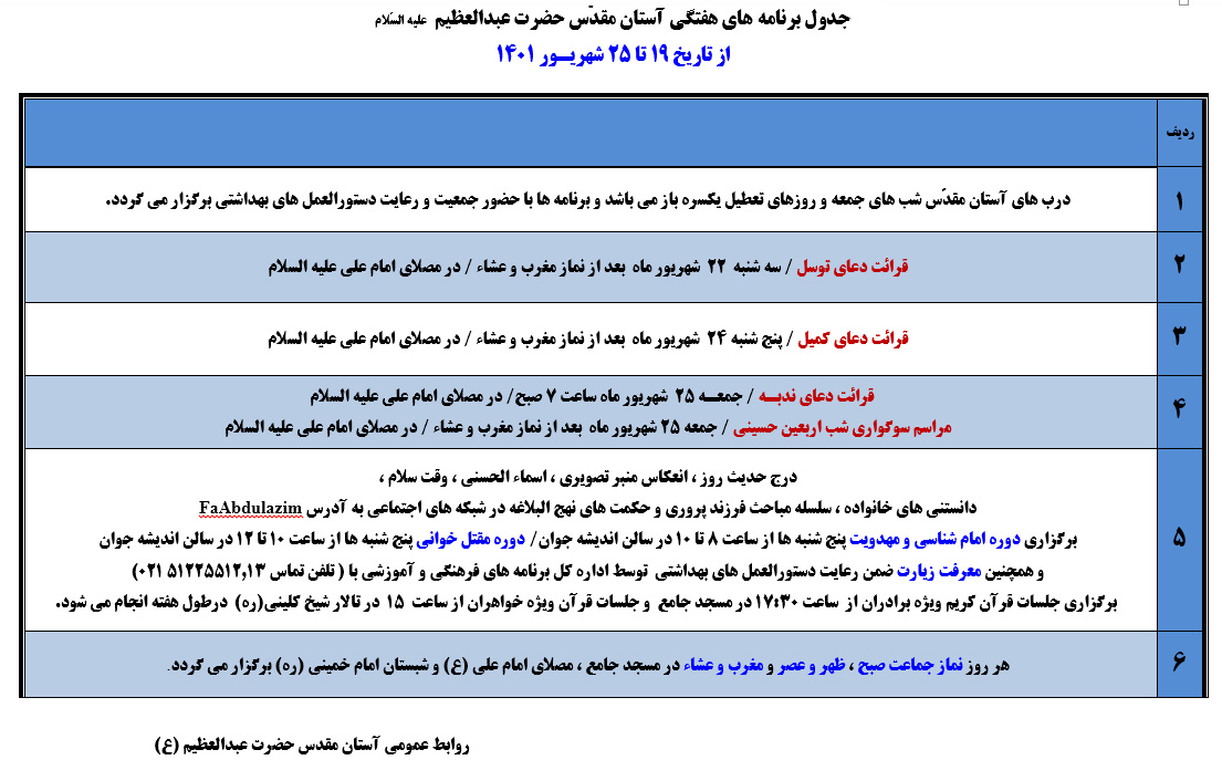 اعلام برنامه های هفتگی آستان مقدّس از 19 شهریور تا 25 شهریور ماه