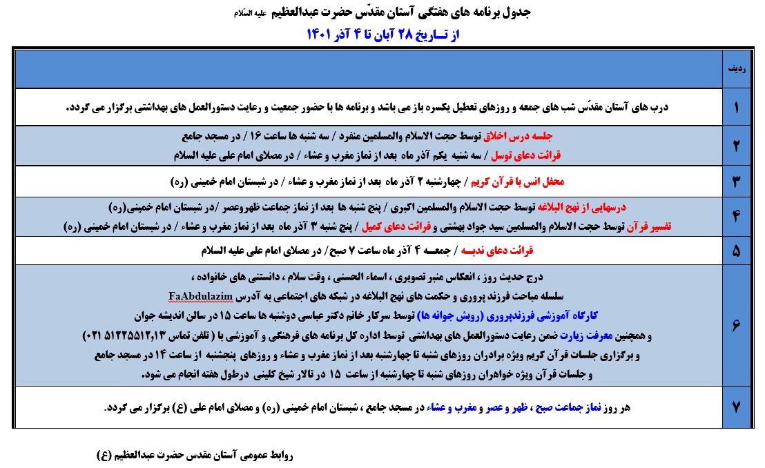 اعلام برنامه های هفتگی آستان مقدّس از 28 آبان تا 4 آذر ماه