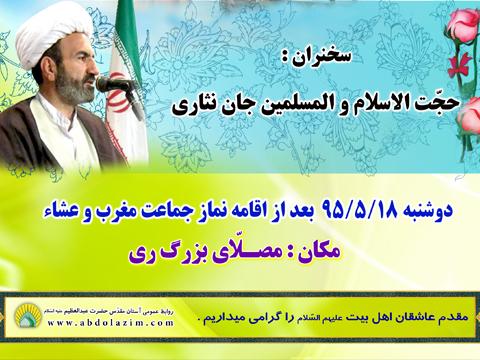 به گزارش اداره ارتباطات آستان مقدّس حضرت عبدالعظيم عليه السلام، اين مراسم با تلاوت قرآن توسط قاري و حافظ ممتاز كشورمان آقاي معتز آقايي آغاز و پس از آن مداح بااخلاص اهل بيت عليهم السلام آقاي علي فراهاني به قرائت زيارتنامه حضرت احمدبن موسي عليهما السّلام خواهد پرداخت.